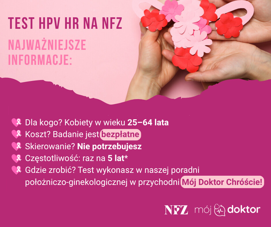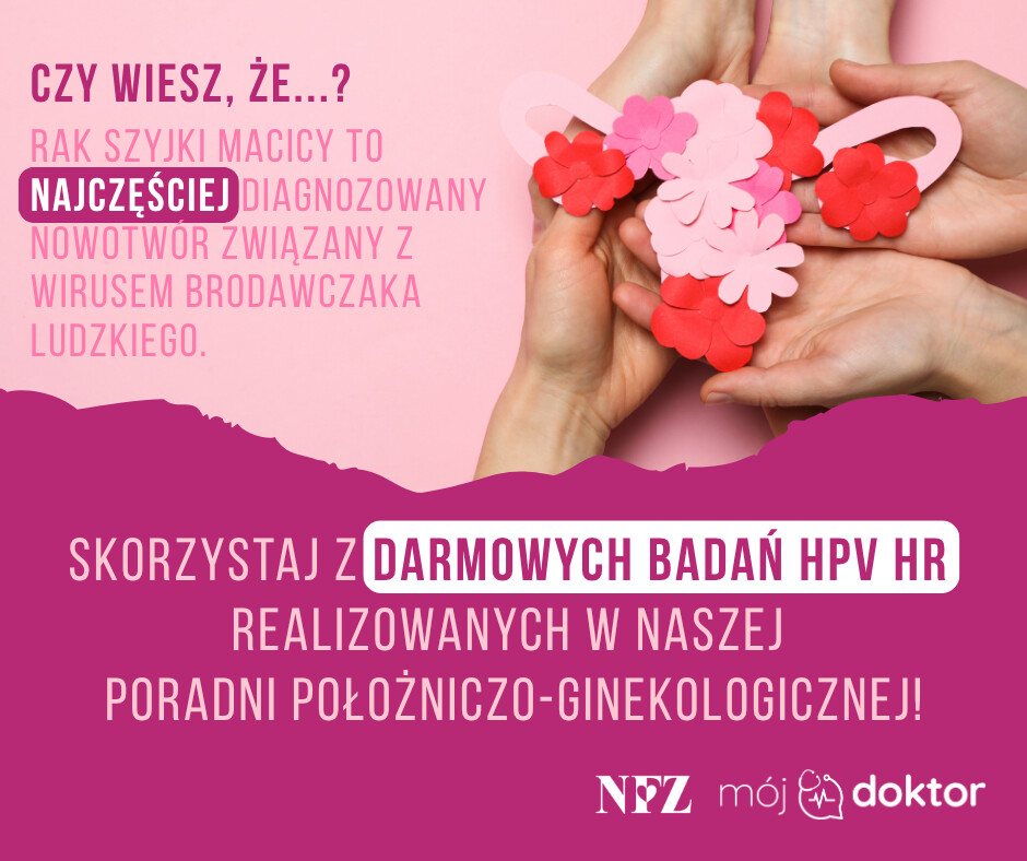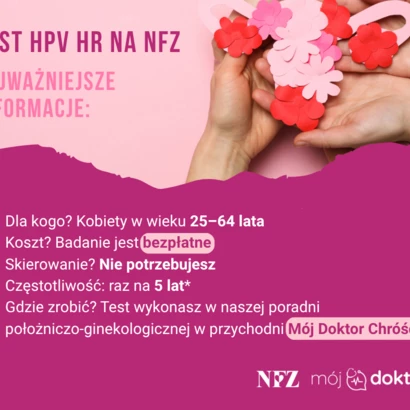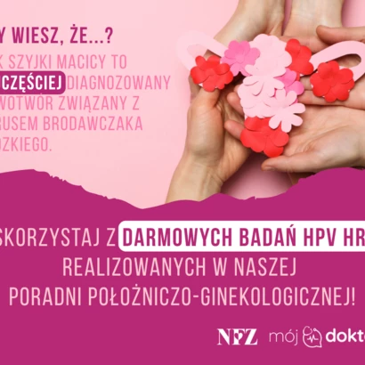 Badanie trwa kilka minut, jest bezpłatne i dostępne bez skierowania. Zachęcamy do umówienia wizyty w naszej przychodni i wykonania testu HPV HR w ramach programu profilaktyki raka szyjki macicy.